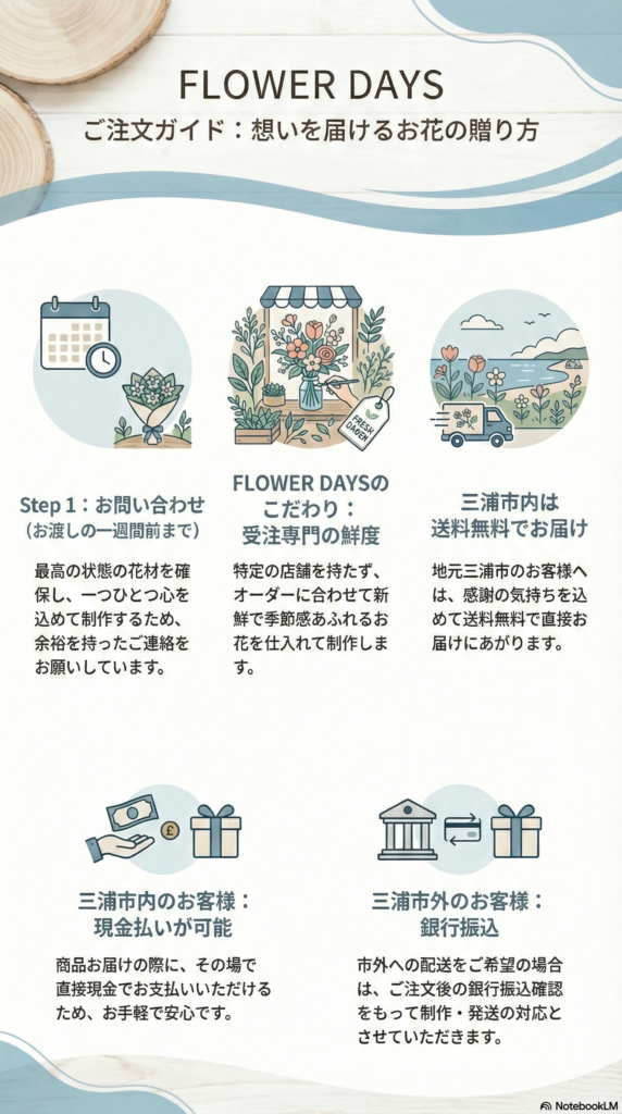 より良い状態でお花をお届けするため、ご注文はお渡しの一週間前までにお願いいたします。特別な日や何気ない日常に、心を込めたお花を添えてみませんか?皆さまの大切な想いをお花にのせて、お届けできることを楽しみにしています。